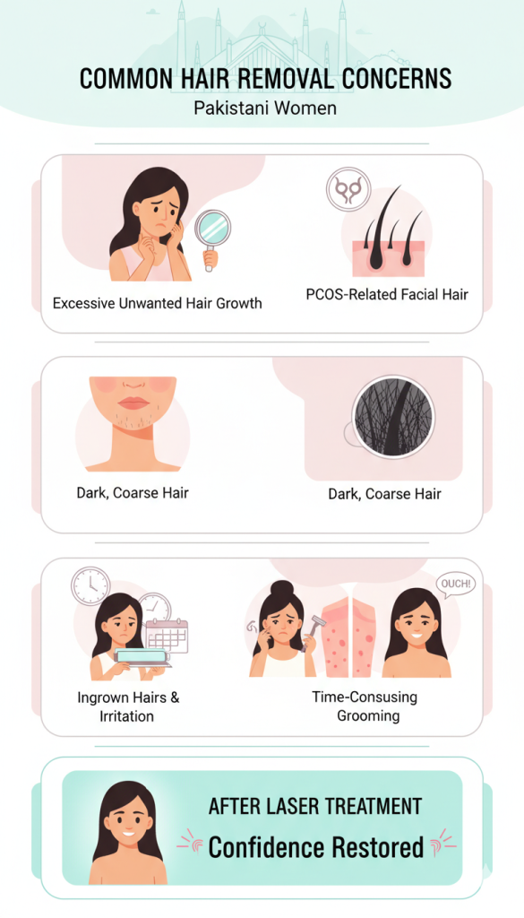 PCOS-Related Facial Hair: Polycystic Ovary Syndrome (PCOS) is increasingly common among Pakistani women, causing hormonal imbalances that lead to excess facial hair growth on the chin, upper lip, jawline, and cheeks. This masculine hair pattern can be emotionally challenging, and laser treatment offers effective management alongside medical care.